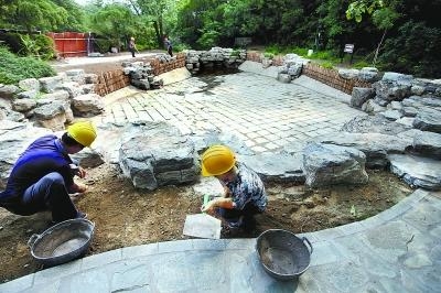 上图为施工人员在香山公园新建成的雨水收集池旁进行绿化土地平整作业。随着雨季的到来,市属公园通过绿地直渗、透水铺装、设置雨水回收池等方式收集雨水,打造绿色型海绵式公园。